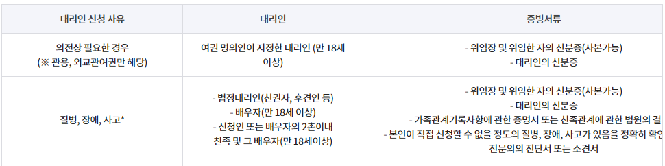 | 법정대리인 신청(친권자, 후견인) | 2촌 이내의 친족(만18세 이상) 신청 |
