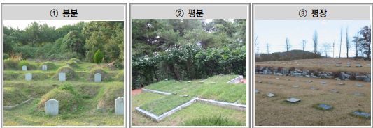 묘지란 분묘를 설치할 수 있는 땅으로 분묘는 우리가 흔히 생각하는 묘(무덤)를 말한다. 그리고 분묘의 형태는 봉분, 평분, 평장으로 구분되며, 봉분은 지면으로부터 1미터 이하, 평분은 50센티미터 이하, 평장은 봉분이 없는 형태로써 비석 역지 눕혀 지면과 평면으로 설치하는 묘를 의미한다.