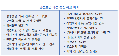 안전 보건 목표는 기업전체, 본사, 부서별로 설정하고 최종목표 이외에 과정 중심 목표를 포함하여 측정 및 평가가 가능하도록 설정합니다. 중소기업의 경우 중대재해가 발생할 가능성이 높은 위험요소를 1~2개로 특정할 수 있다면 이에 대한 예방 활동을 목표로 설정합니다. 예를 들어 끼임 위험요인 발굴 및 개선 이행률, 끼임 작업 예방 안전작업 절차서 도입, 개선 건수 등을 목표로 설정할 수 있습니다.