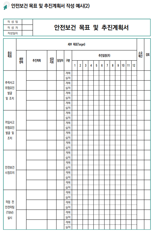 아래는 안전보건 목표 및 추진계획서 작성 예시입니다. 안전보건 과정 중심 목표 예시를 참고하여 안전보건 목표 및 추진계획서를 작성하도록 합시다. 문서 작업 자체가 목표가 되면 안되며, 안전보건 목표를 설정하는 것이 어렵다면 사업장 위험성 평가를 통해 개선할 사항을 먼저 확인 후 목표 설정하는 것이 효과적입니다.