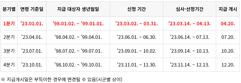 ※ 몇 분기부터 지급대상자인지 확인 후 '22년 2분기 ~ '22년 4분기까지 지급받지 못한 분기가 있다면 체크